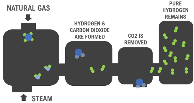 Most hydrogen today is made by steam-methane reformation of natural gas. It’s a safe, cost-effective, and efficient process where methane (CH4) —the main component in natural gas—reacts with high-temperature steam (usually in the presence of a catalyst) to separate the hydrogen from other molecules.